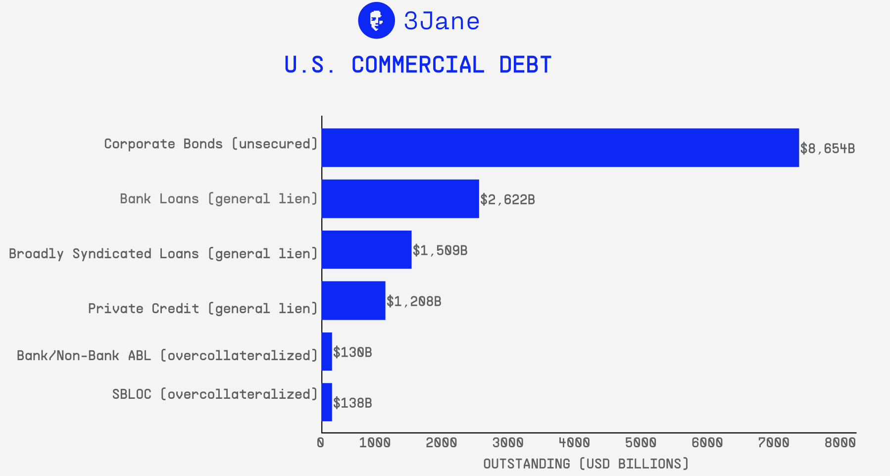 In the absence of legal recourse and a robust identity primitive in an anonymous and adversarial context, this is the only model that has scaled in DeFi to date. However, it only represents ~2% of all outstanding commercial debt in the form of Asset-Based Lending and Securities-Backed Lines of Credit within the broader 14.2t market in the United States.